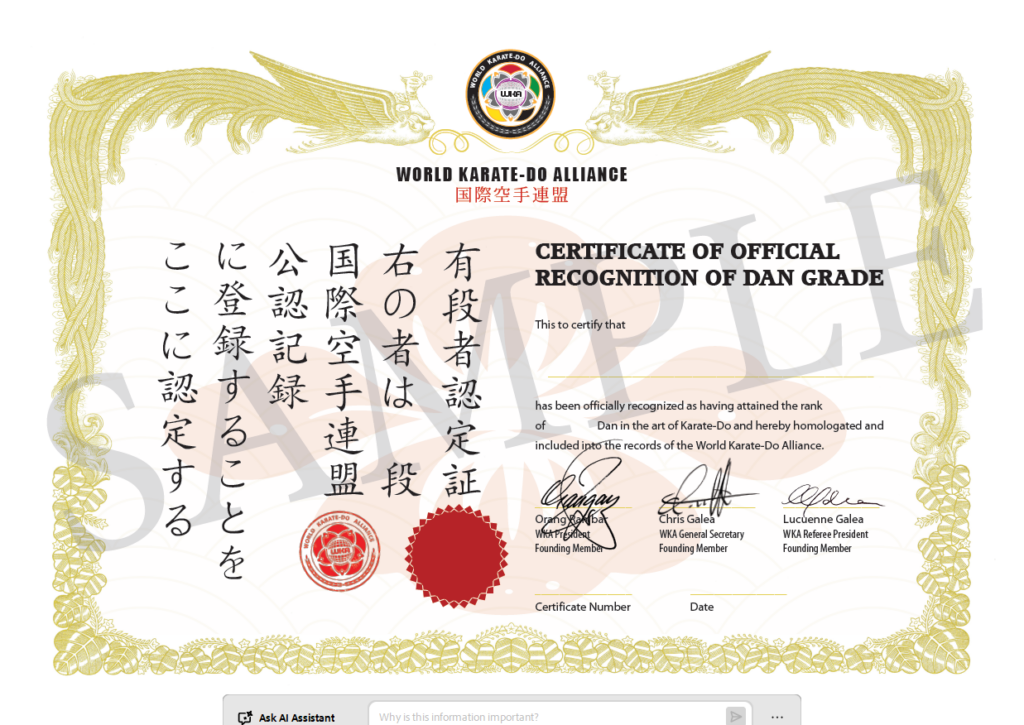 MERCHANDISE BLAZER BADGE Handmade bullion blazer badge 25 Euros NECKTIE Woven microfiber necktie – Navy blue/ Red 20 Euros LAPEL BADGE/ PIN Solid polished brass – 2.5cm 6 Euros BLAZER BADGE HOLDER/ POCKET CLIP PVC with fabric backing – Black 15 Euros EMBROIDERED PATCH Full colour embroidered Gi patch – 9cm 15 Euros WKA HOMOLOGATION CERTIFICATE Certificate of Official Recognition of Dan Grade – A3 50 Euros